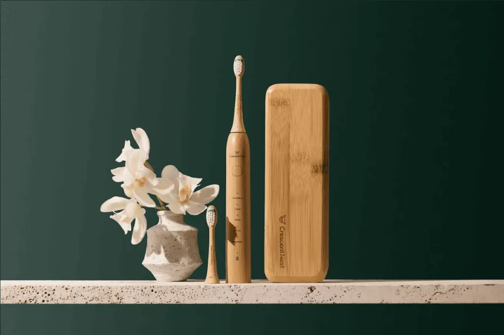 For the Australian and New Zealand markets, Crescent Nest has developed a sustainable sonic electric toothbrush designed to last. Instead of replacing the whole brush, only the bamboo heads are swapped, reducing plastic waste by around 85% compared to conventional toothbrushes. The head base is made from FSC-certified bamboo, and the bristles are made from PA11 nylon derived from castor oil, chosen for durability and hygiene.